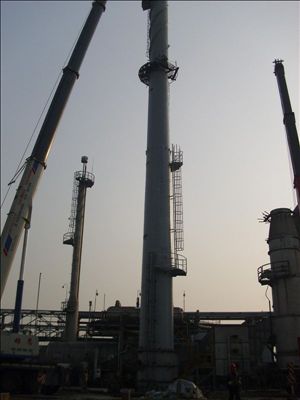 該工程是南通瑞利化學(xué)有限公司為滿足環(huán)保需要,將熱氧化爐裝置原30米煙囪拆除更換成50米煙囪,系該公司今年重點技改項目。新煙囪仍是鋼制,煙囪底座直徑2.8米、頂口直徑1.8米,本體總重62T,一處承擔(dān)基礎(chǔ)、煙囪制作安裝及配套等全部施工任務(wù)。為了確保工程質(zhì)量和吊裝安全,一處現(xiàn)場施工人員精心組織施工,本體制作采取工廠化預(yù)制,分節(jié)運(yùn)到現(xiàn)場再組對;現(xiàn)場使用300T吊車分2節(jié)吊裝,在30米處空中組對。