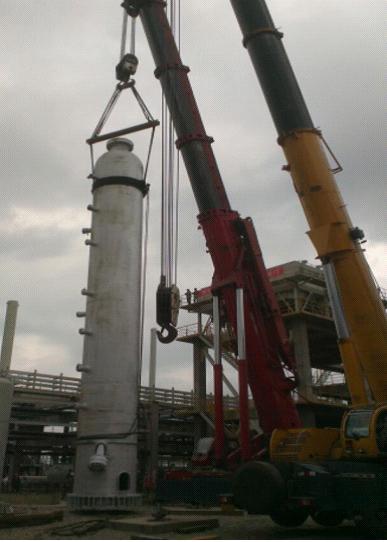 這樣的笑容來之不易。3臺反應器,最高的有19米多,單臺重量最大達到141余噸。總包單位在設計的時候未考慮吊耳。由于材質(zhì)特殊,也無法在設備上施焊增加吊耳,這是最棘手的。總包單位束手無策,但又不同意項目部提出采用鋼絲繩捆綁式的吊裝方案,猶豫著不愿意簽字,萬一有個失誤,后果不堪設想!為了這次吊裝,江蘇分公司給予了大力支持,派出了經(jīng)驗豐富的起重吊裝專業(yè)工程師,多次到現(xiàn)場、到基地與總包單位反復論證方案的可行性。激烈的討論、嚴謹?shù)挠嬎恪㈩愃茦I(yè)績的展示……一次又一次的努力,項目部滿滿的信心和十足的把握最終讓總包單位同意了這個方案。
