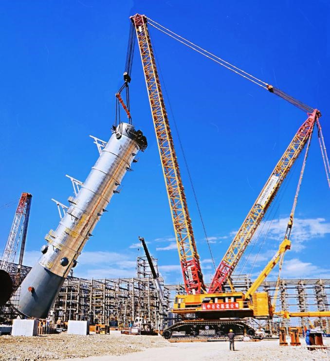 自今年9月20日以來, 苯乙烯項目部共成功吊裝第一脫氫換熱器、三聯(lián)換熱器、轉烷基化反應器、苯處理器、多乙苯塔、苯/甲苯塔等大型設備13臺,吊裝總噸位約達2000噸。其中,最重設備三聯(lián)換熱器重687噸,高41米,最大吊裝高度63米;而這次吊裝的低壓粗苯乙烯塔,塔體總高度92.2米,重量950噸,是整個大型設備吊裝中最復雜的設備之一,分兩段運至施工現(xiàn)場,由2000噸吊車吊起來空中組對、焊接。