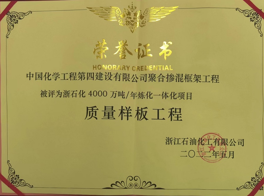 近日,浙江舟山魚山綠色石化基地管委會、浙江石油化工有限公司召開2021年度浙石化4000萬噸/年煉化一體化(二期)總結表彰大會。會上,由華東公司承建的1#6萬噸/年溶聚丁苯&10萬噸/年稀土順丁橡膠裝置聚合摻混框架工程獲評質量樣板工程。