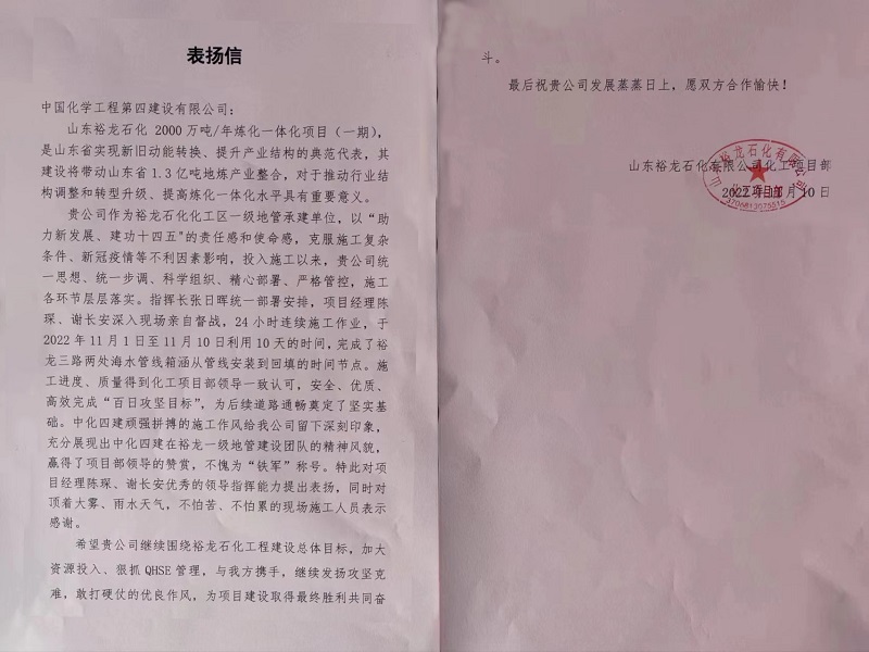 中化勞務(wù)承建的山東裕龍石化項(xiàng)目獲業(yè)主來(lái)信表?yè)P(yáng)