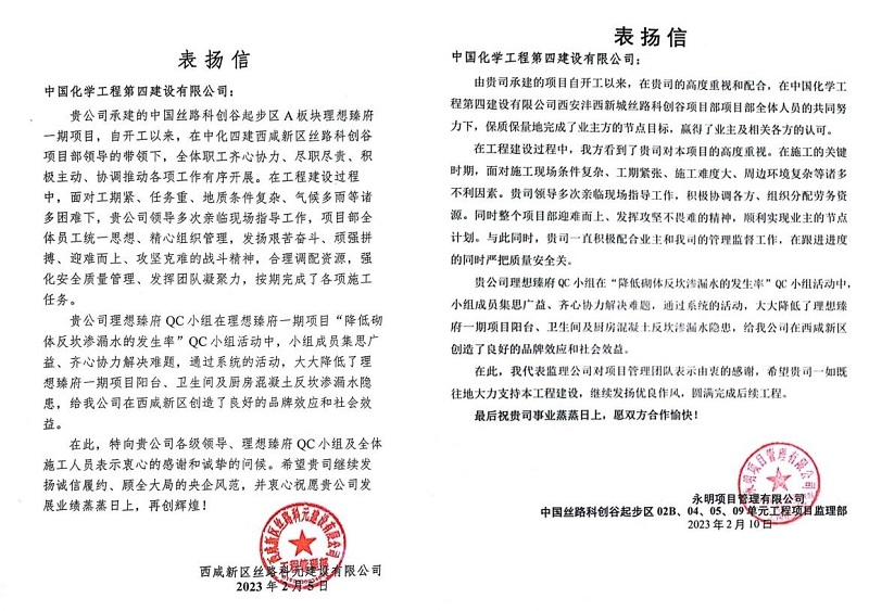 近日,華東公司收到西咸新區絲路科元建設有限公司和永明項目管理有限公司發來表揚信,對華東公司承建的中國絲路科創谷理想臻府一期項目保質保量完成節點目標以及“降低砌體反坎滲漏水的發生率”QC小組活動中所做出的成績,給予表揚和感謝。