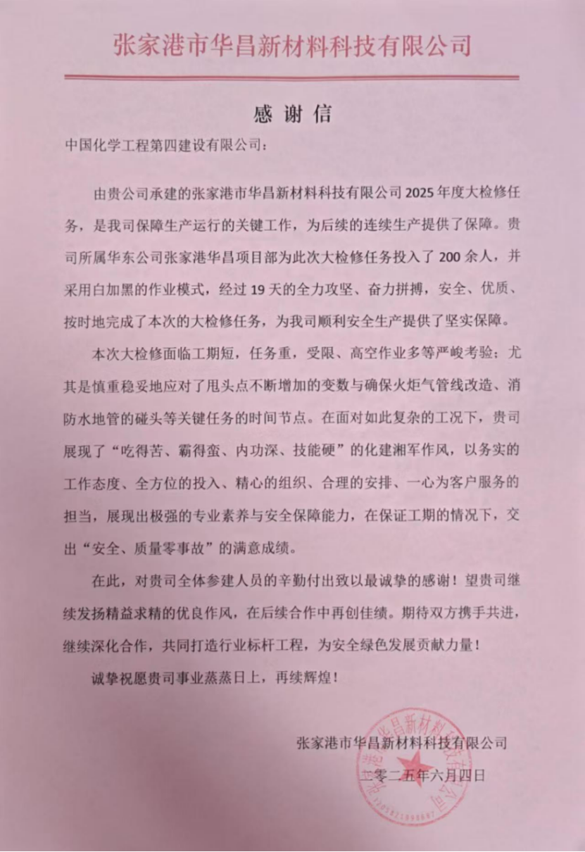 近日,江蘇華昌新材料科技有限公司向公司發來感謝信,對華東公司在張家港華昌2025年度零星維修及技改技措項目大檢修中的突出表現給予高度贊揚和衷心感謝。