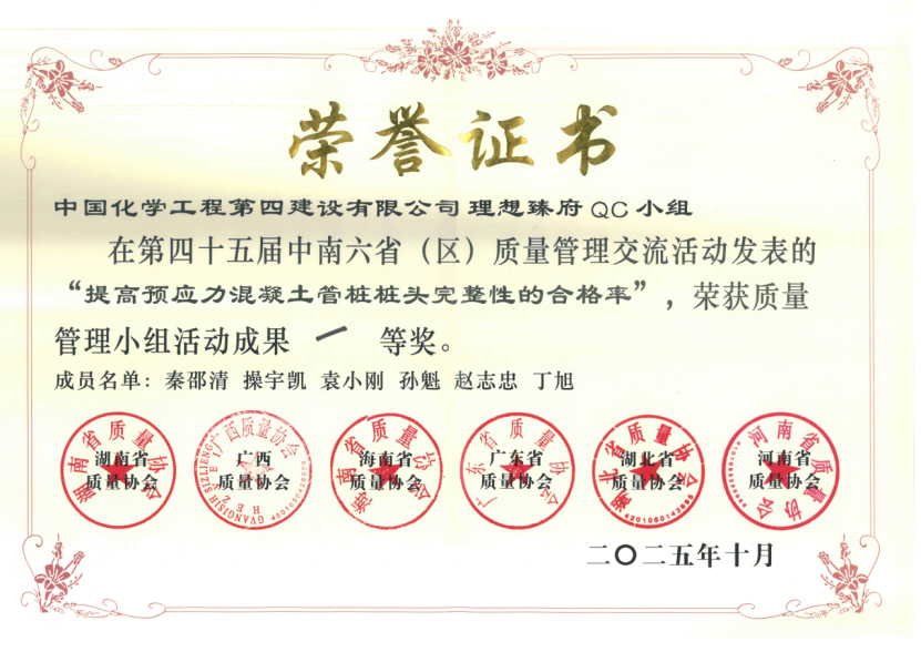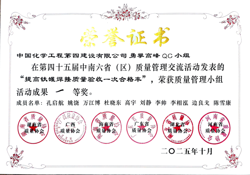 10月9日至12日,第45屆中南六省(區)質量管理交流會在湖南鳳凰召開,中國化學四化建選送的“理想臻府QC小組”成果《提高預應力混凝土管樁樁頭完整性的合格率》與“勇攀高峰QC小組”成果《提高鈦罐焊接質量驗收一次合格率》,在會上雙雙榮獲一等成果獎,彰顯公司在質量管理創新領域的扎實實力。
