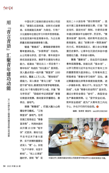 近日,由共青團(tuán)中央主管主辦的工作指導(dǎo)刊物《中國(guó)共青團(tuán)》2025年第20期專版刊載了中國(guó)化學(xué)工程四化建青年理論學(xué)習(xí)工作經(jīng)驗(yàn)文章《用“青言青語(yǔ)”匯聚化建青年建功動(dòng)能》,對(duì)公司用黨的創(chuàng)新理論賦能青年成長(zhǎng)、用黨的初心使命引領(lǐng)青年建功的創(chuàng)新路徑進(jìn)行專題報(bào)道,為央企青年思想政治引領(lǐng)工作蓬勃發(fā)展提供了可復(fù)制、可推廣的實(shí)踐樣本。