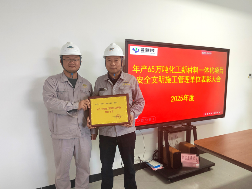 近日,公司承建的廣西昌德新材料有限公司年產65萬噸化工新材料一體化項目傳來喜報,項目部憑借嚴格規范的現場管控、過硬的安全業績,被業主授予“2025年度安全文明施工管理先進單位”稱號。