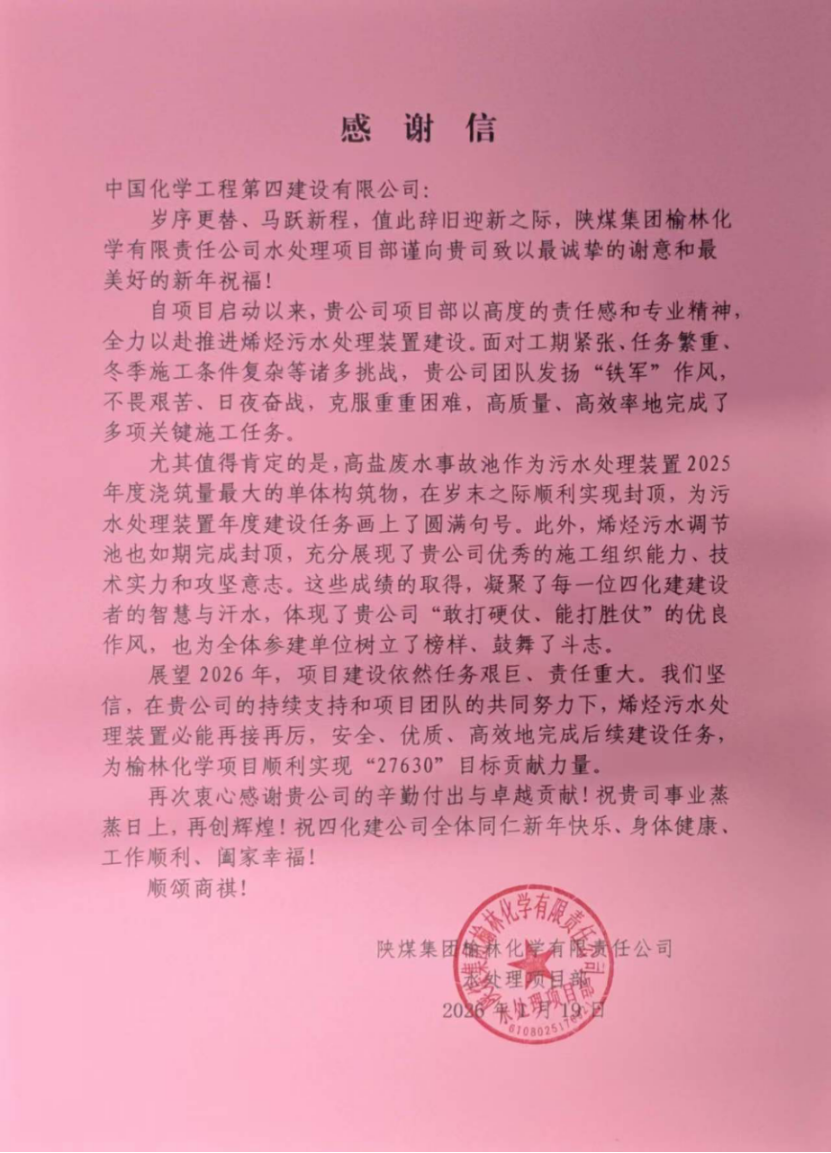 信中指出,陜煤榆林化學(xué)項目是國家推動能源結(jié)構(gòu)轉(zhuǎn)型、落實“雙碳”目標(biāo)的重要標(biāo)志性工程,也是陜西省構(gòu)建現(xiàn)代能源萬億級產(chǎn)業(yè)集群的核心載體。自項目啟動以來,面對工期緊張、任務(wù)繁重、冬季施工環(huán)境復(fù)雜等多重挑戰(zhàn),項目團(tuán)隊發(fā)揚(yáng)鐵軍作風(fēng),以高度的責(zé)任感和專業(yè)精神日夜奮戰(zhàn),成功攻克多項關(guān)鍵任務(wù)。其中,2025年度澆筑量最大的單體構(gòu)筑物——高鹽廢水事故池于歲末順利封頂,烯烴污水調(diào)節(jié)池如期完成,標(biāo)志著污水處理裝置年度建設(shè)目標(biāo)圓滿完成,展現(xiàn)了優(yōu)秀的施工組織能力與攻堅實力。