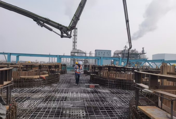 截至目前,項目部已順利完成多個重要節點任務:AB反應單元設備基礎按期交付、包裝廠房六層框架混凝土澆筑完成、南區地坪90%澆筑到位,項目建設取得階段性進展。通過優化施工方案、加強現場管理、推廣先進技術,項目部全體職工在確保安全質量前提下,施工進度持續加快,為項目投產奠定堅實基礎。